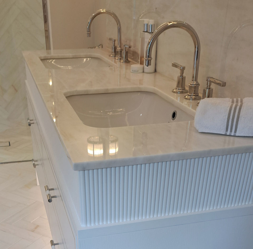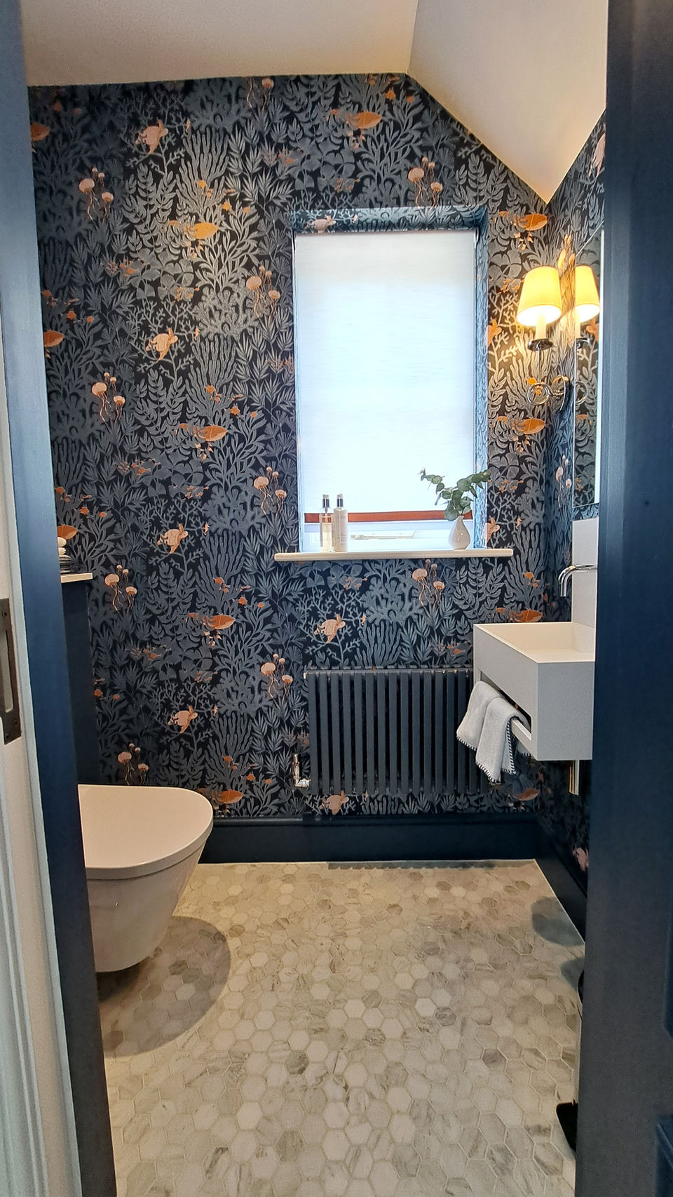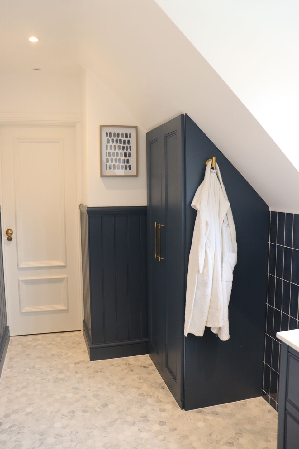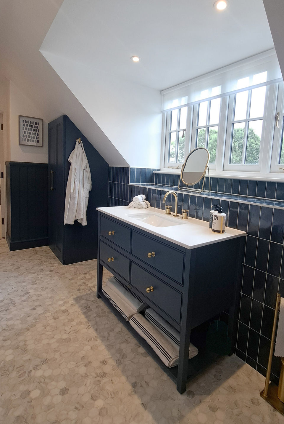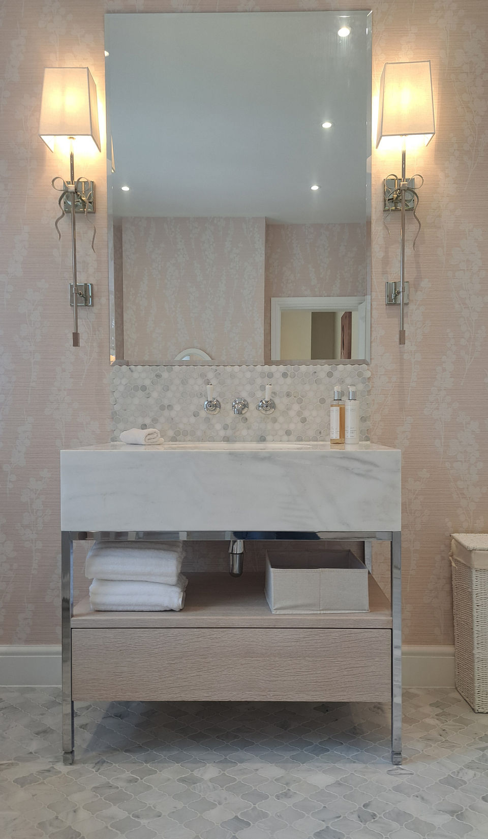 This country home renovation featured a series of bespoke ensuite bathrooms, each designed to complement its adjoining bedroom while reflecting the elegant character of this Hertfordshire property. The designs blend classical details with contemporary elements, from a dramatic navy and gold powder room to serene spa like ensuites with custom vanities. Thoughtful material selections and detailed technical drawings ensured seamless installations, resulting in refined, welcoming bathrooms that have become standout features of the home.